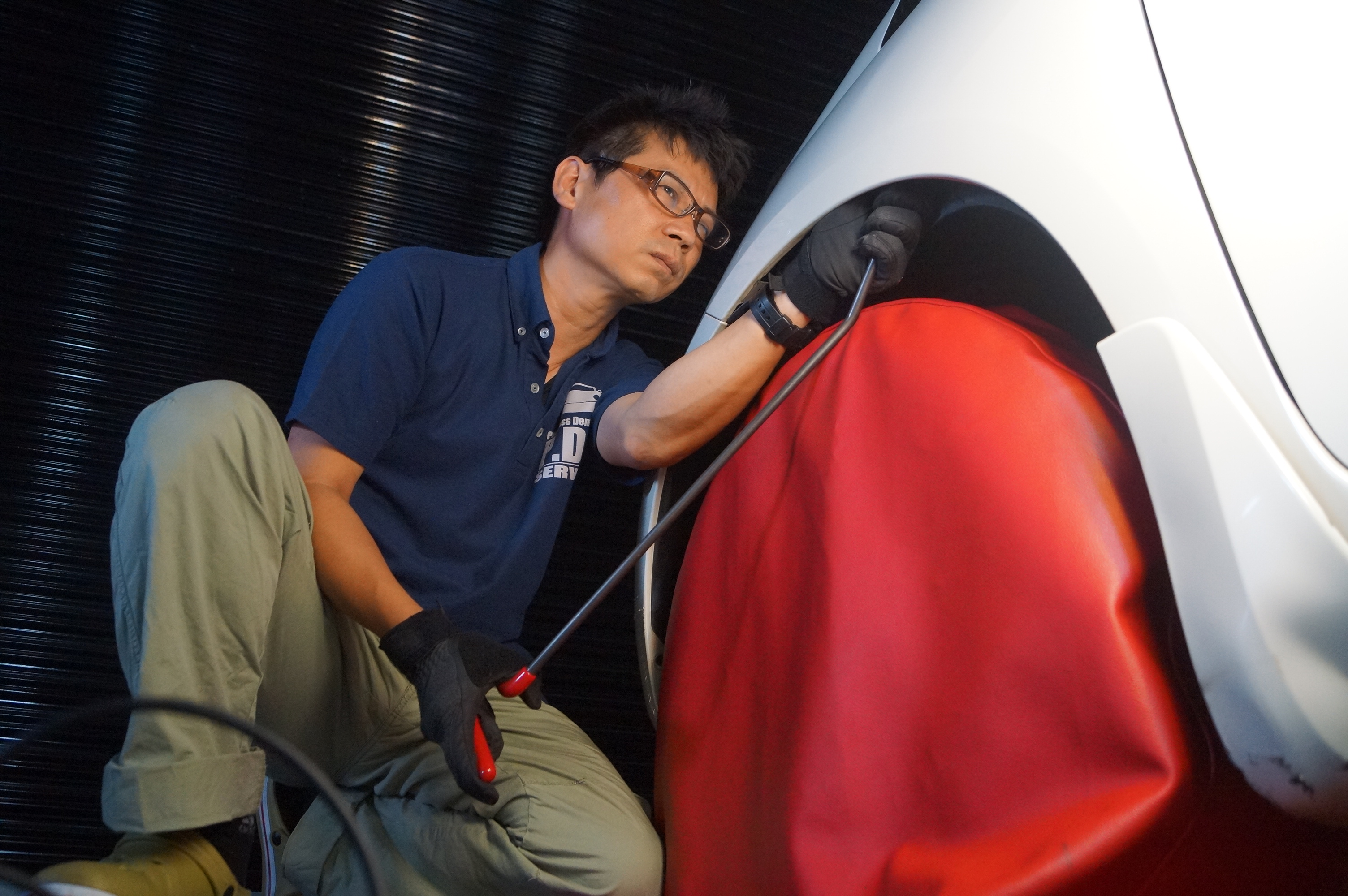 デントリペアは数十本の特殊専用ツールを使い分け、車のボディにできた凹みの裏側からゆっくり丁寧に押し上げることで、塗装することなく短時間で安価に、とても綺麗に仕上げることができます。 その仕上がりは査定士が見ても発見することが出来ない程で、近年自動車業界でなくてはならない存在になり始めております。